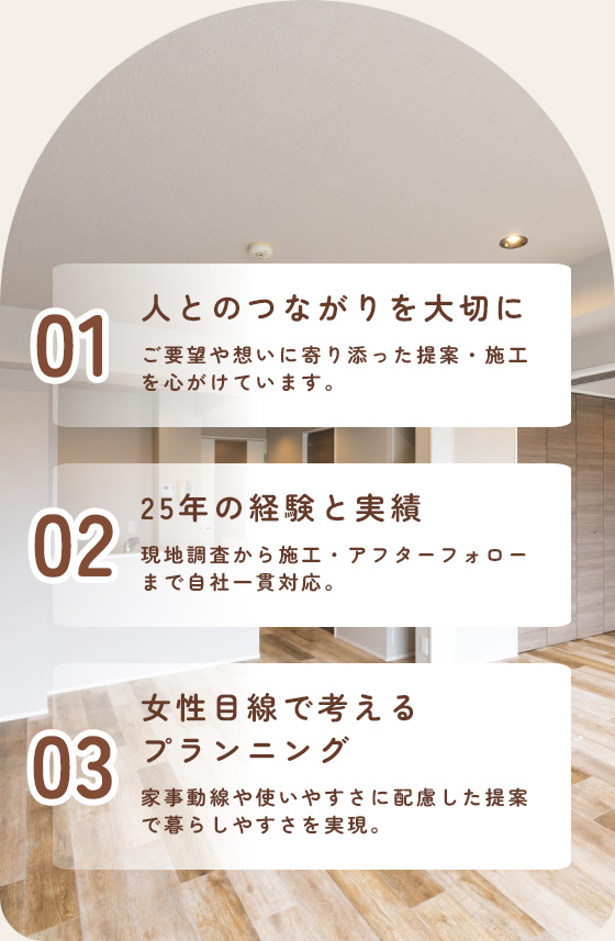 当方では、お客様の想いに寄り添いながら、住まいに関するあらゆるご要望に対応しています。25年の経験に基づき、現地調査から施工・アフターフォローまで自社一貫で対応。さらに、女性目線でのプランニングにより、家事動線や使い勝手にも配慮した住まいづくりを実現しています。